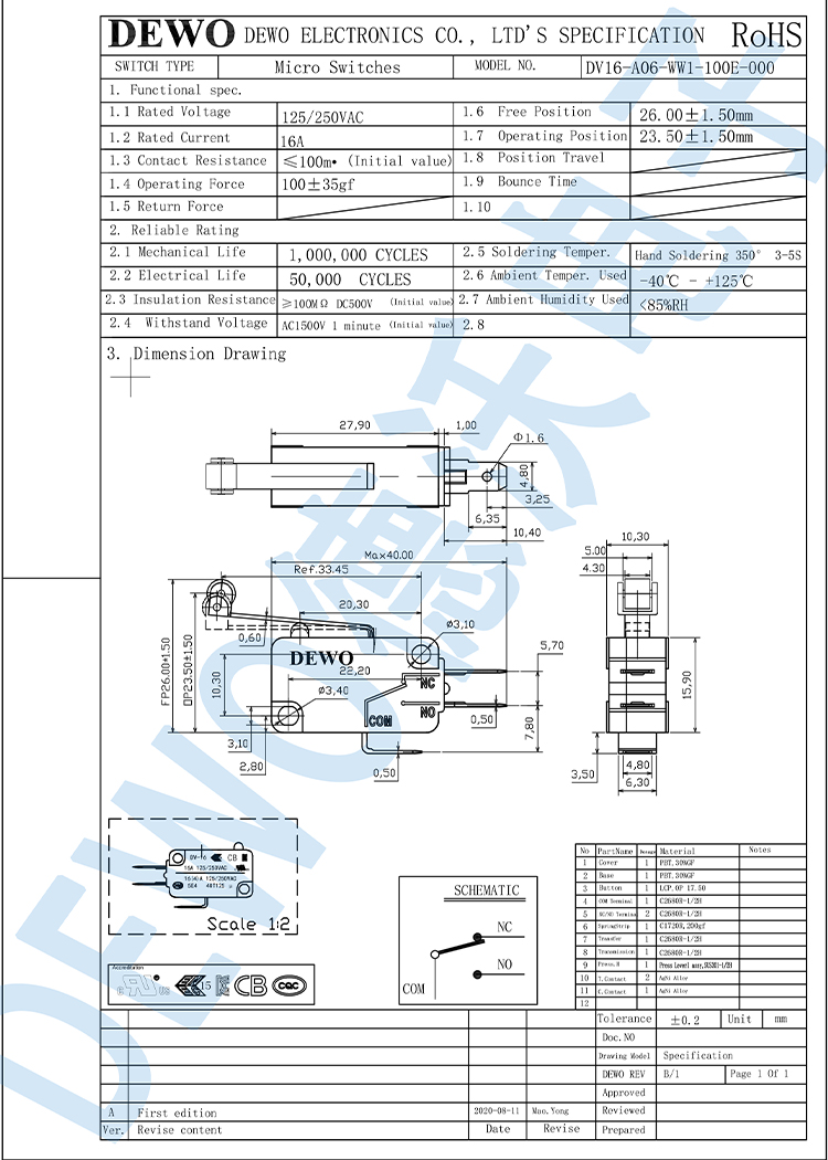 DV-16-A06-WW1-100E型微動(dòng)開(kāi)關(guān)
