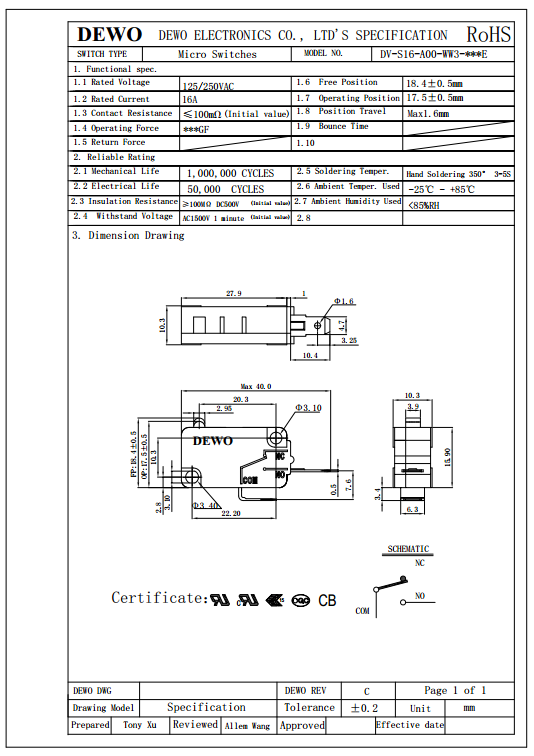 DV-16-A00-WW3-200E型微動(dòng)開(kāi)關(guān)