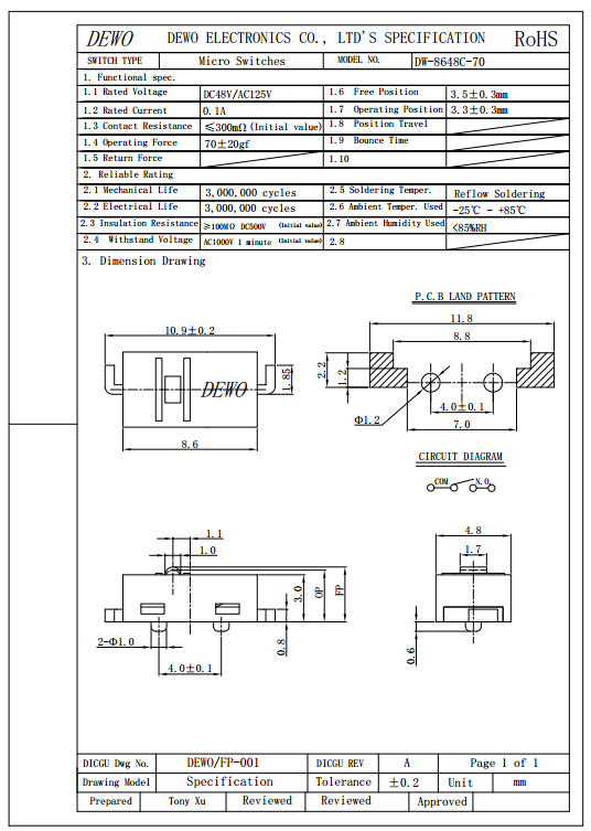超小型微動(dòng)開關(guān) CM1873101S100-2
